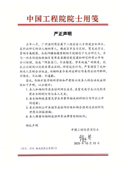 10月11日,我国解剖学泰斗、中国工程院院士、中国临床解剖学创始人、中国数字人和数字医学倡导者钟世镇院士办公室发来由院士手书签字并委托发布的严正声明。声明表示,去年钟院士百岁生日时,杨炯等五人冒充其学生、冒领专属服装,与钟院士纠缠拍摄录制相片视频,并将未经授权的相片发布在其微信朋友圈和研究所等公开场合以炫耀,造成“师出名门、行业翘楚、学术权威”假象。